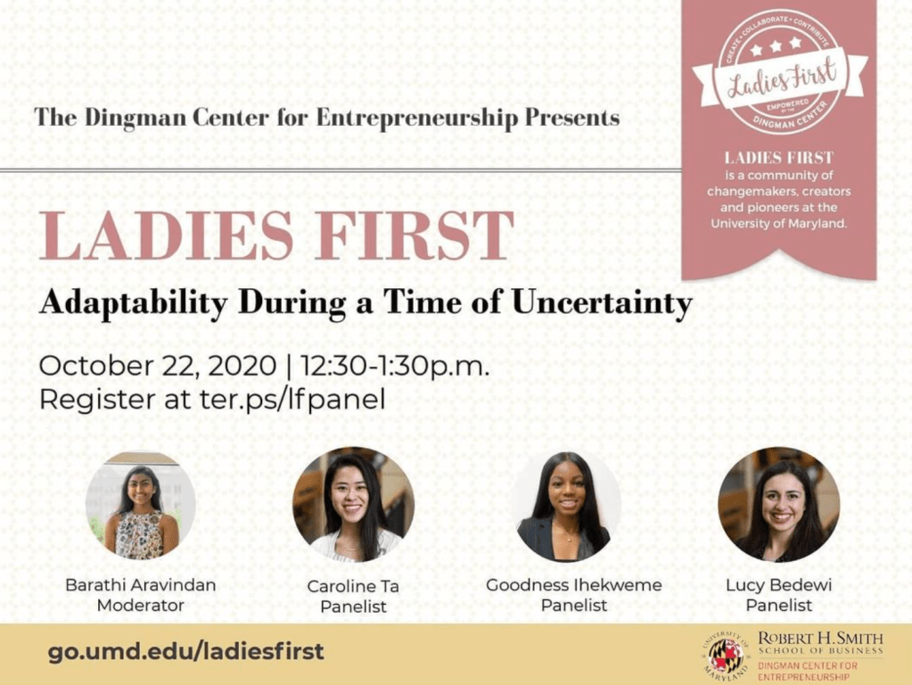 On October 22, we held a Ladies First Alumni Panel: Adapting During Times of Uncertainty. Three alumni of the Ladies First Founders cohort reflected on their experiences in the course and talked about the progress they have made on their business ideas. The panel was moderated by Barathi Aravindan, the Dingman Center’s own Venture Intern who is also an alumnae of Ladies First Founders. You can watch the session here.
